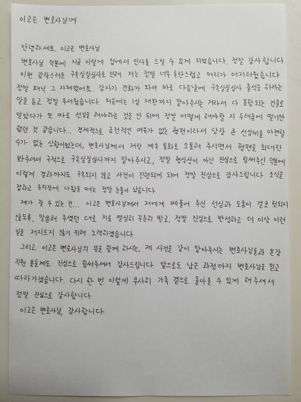 저희 법무법인 온강을 믿고 맡겨주신 의뢰인분의 법무법인 온강 후기입니다.