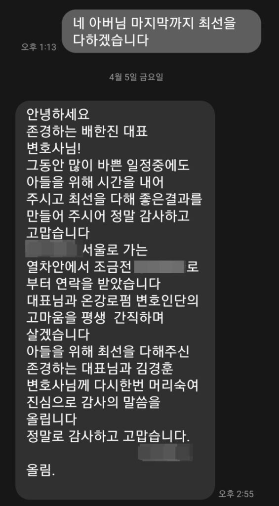 대표님과 온강 로펌 변호인단의 고마움을 평생 간직하며 살겠습니다.