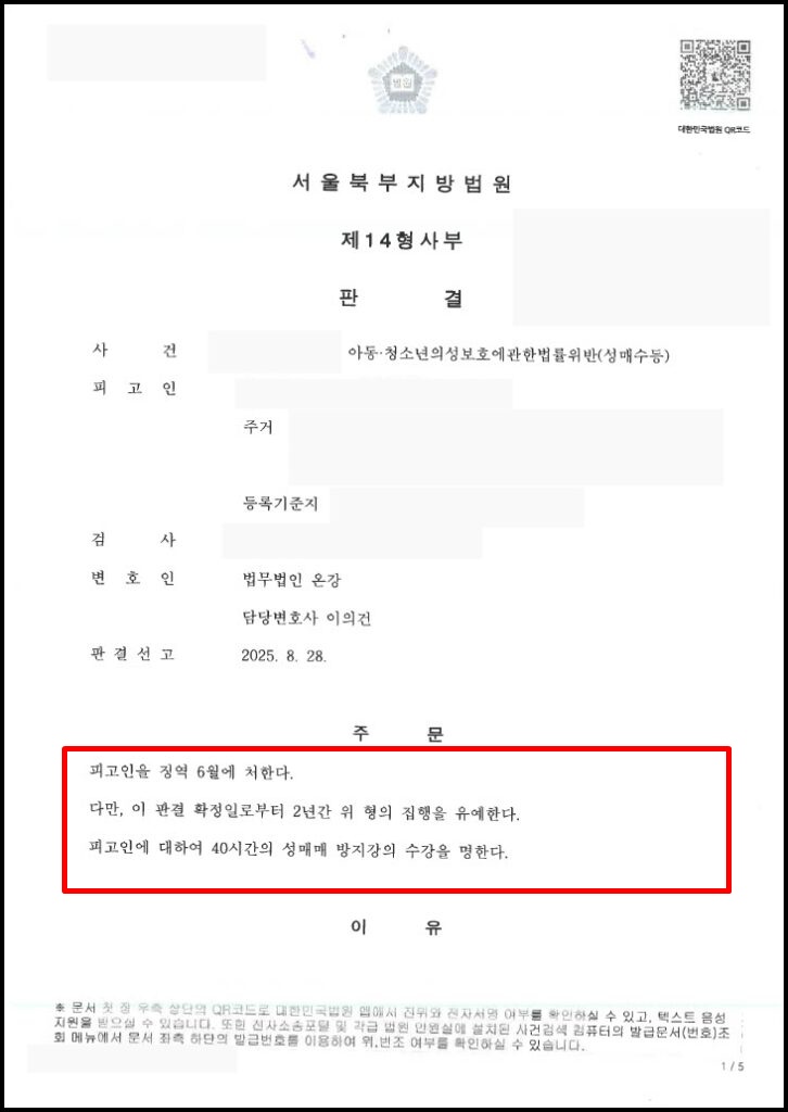 실제로 의뢰인도 상대방의 적극적인 기망과 금품 갈취까지 당했음에도 중대한 성범죄자로 남을까 두려워 온강을 찾으셨는데요. 저희는 상대방의 미성년자 위장 정황과 의뢰인의 피해자성을 면밀히 입증하며, 집행유예와 함께 신상정보 공개·취업제한 명령까지 면제받게 할 수 있었습니다.