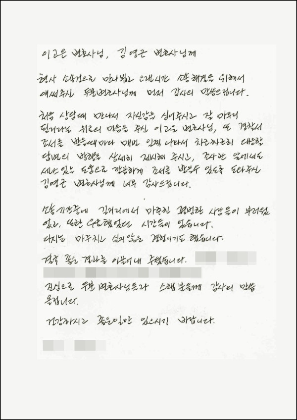 진심으로 두 분 변호사님들과 스텝분들께 감사의 말씀 올립니다.