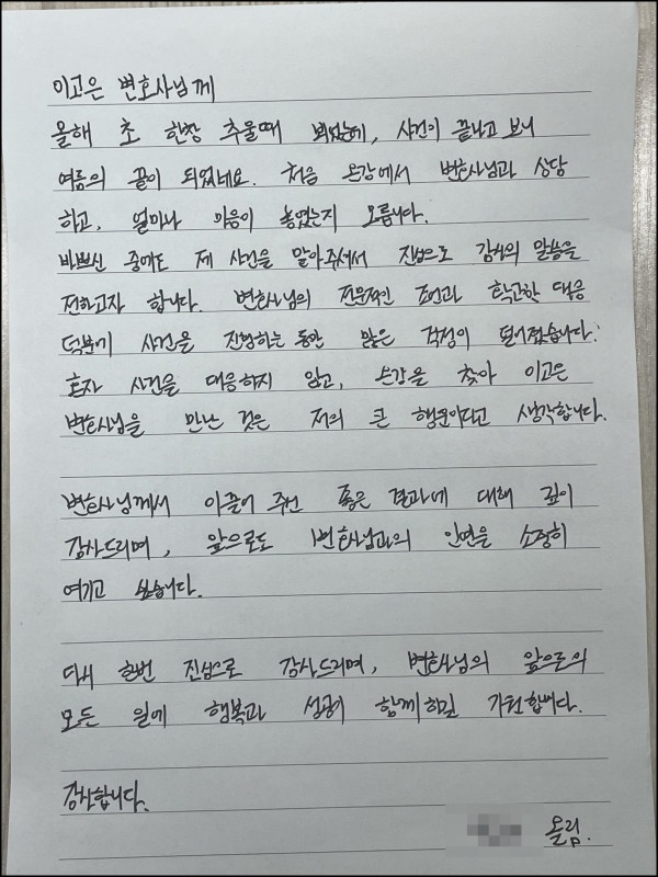 변호사님께서 이끌어 주신 좋은 결과에 대해 깊이 감사드리며,