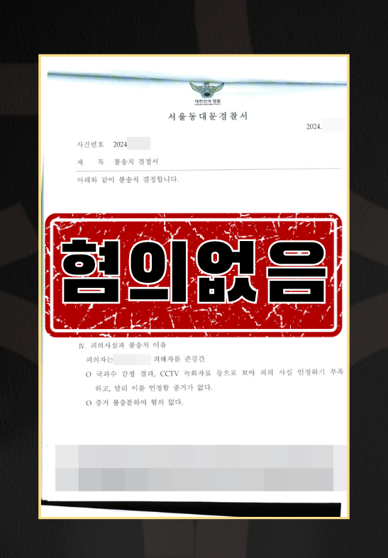 결국 피해자의 진술만으로는 범죄를 인정하기 어렵다고 판단하여, 의뢰인에게 불송치(혐의없음) 처분을 내렸습니다. 이로써 의뢰인은 억울한 누명을 벗고 안심하며 일상으로 돌아갈 수 있었습니다.