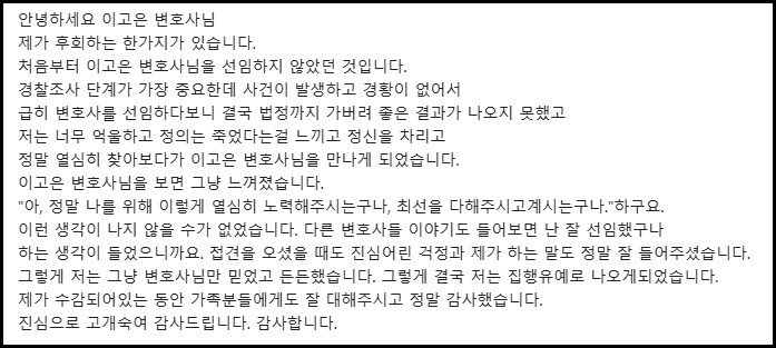 그렇게 저는 그냥 변호사님만 믿었고 든든했습니다.