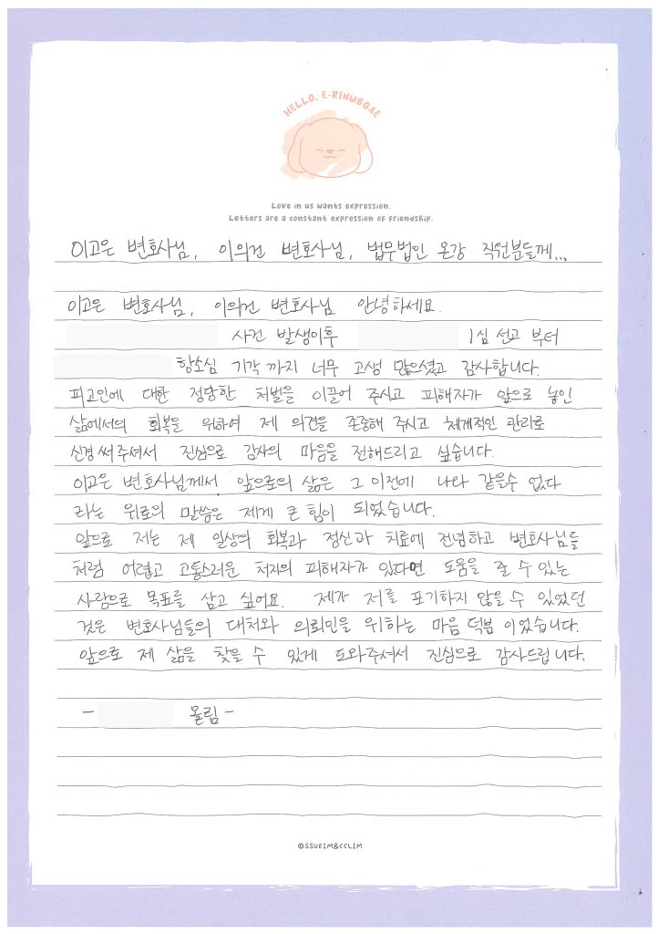 저희 법무법인 온강을 믿고 맡겨주신 의뢰인분의 법무법인 온강 후기입니다.